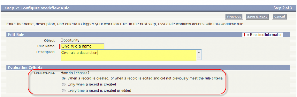 In the ”Evaluation Rules” section of the page, Salesforce is asking you to set theEvaluation Criteria for WHEN you want the record to be evaluated (upon creation, or edit, or both). In the same order as the screen shot above, I’ve rephrased the options to hopefully be more clear: