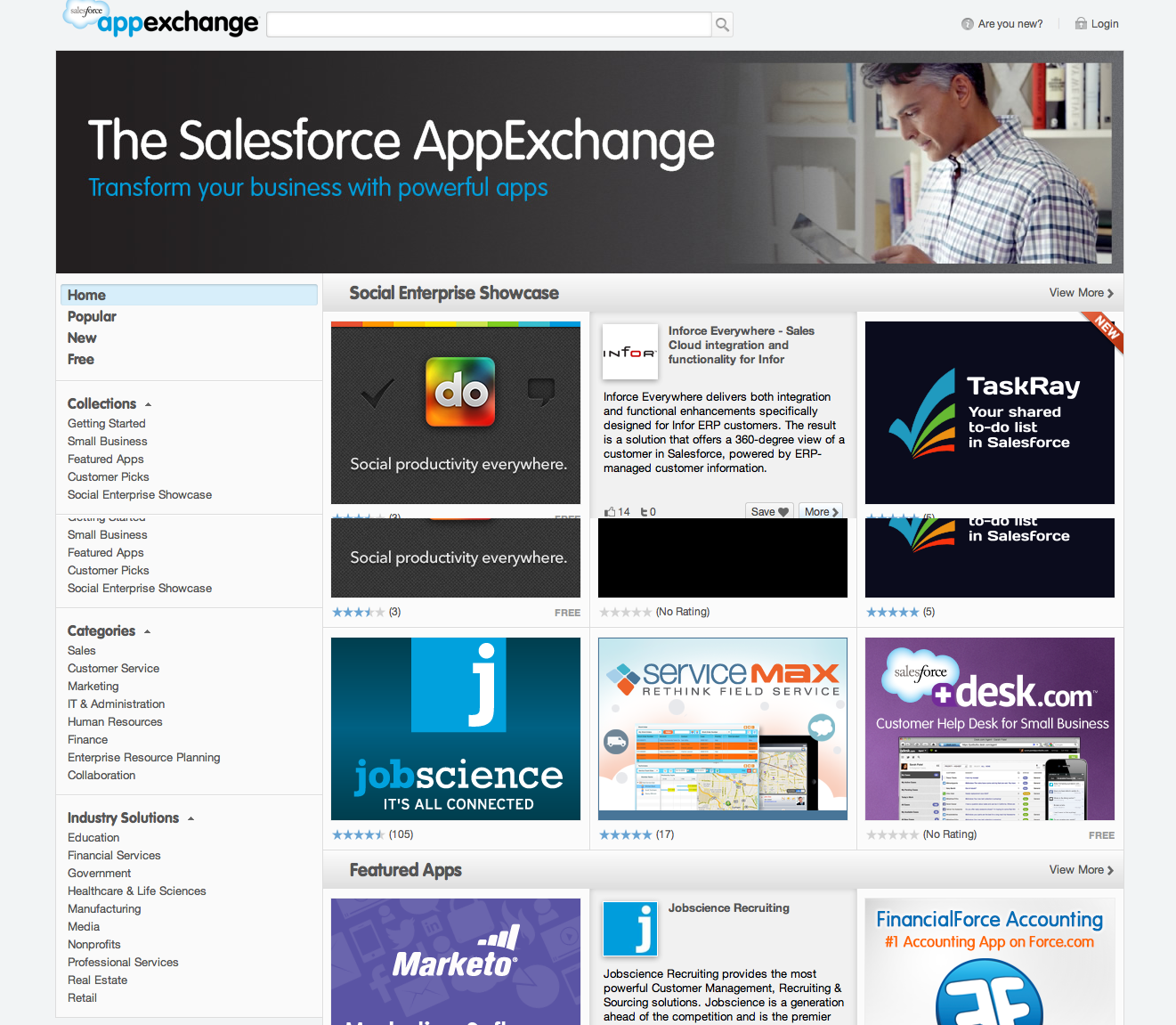 So what’s all the hubbub about the new AppExchange? The first thing you’ll notice are the large banner and tile listings (rollover them with your mouse – cool!). I think the goal here was to have a consistent experience across tablets and mobile devices – and it does look great: